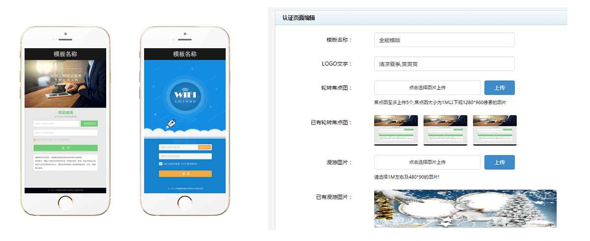 微信连WiFi,APP认证,手机短信认证,QQ认证,微博认证,免认证等,认证配置可根据需求组合定制